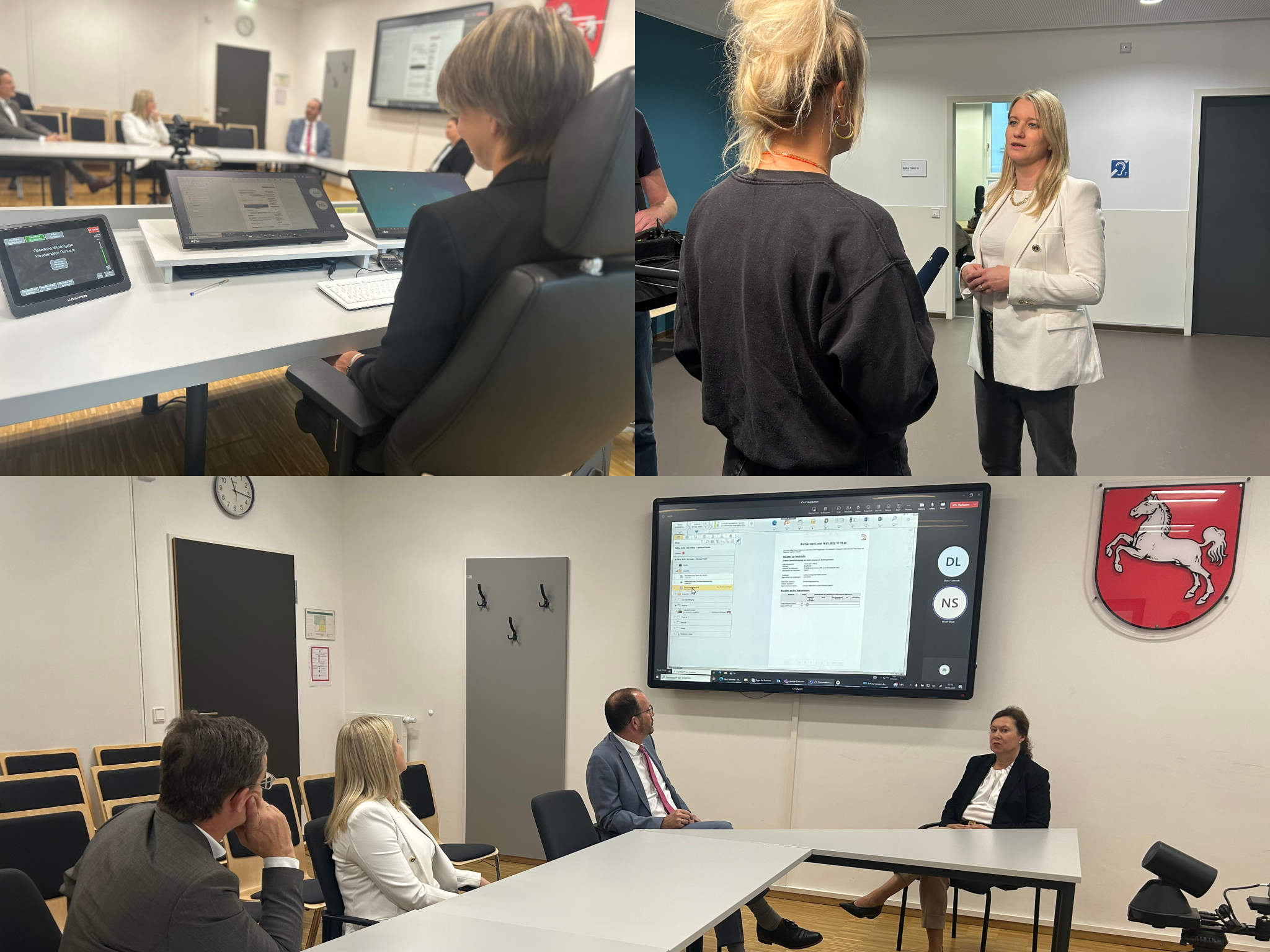 Verstaubte und meterhohe Aktenberge gehören in der Arbeitsgerichtsbarkeit spätestens seit Oktober 2023 der Vergangenheit an. Wenn die Kolleginnen und Kollegen der insgesamt 15 niedersächsischen Arbeitsgerichte und des Landesarbeitsgerichts morgens nun ihre Büros betreten, bietet sich ihnen dort ein ganz neues Bild: leere Aktenböcke und keine dicken Papierstapel mehr. Diesen digitalen Durchbruch nahm die Niedersächsische Justizministerin Dr. Kathrin Wahlmann zum Anlass, das Landesarbeitsgericht zu besuchen und sich den Umgang mit der elektronischen Akte hautnah vorführen zu lassen.
