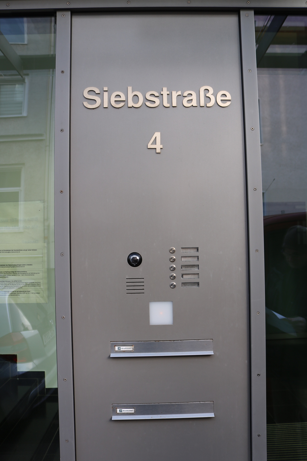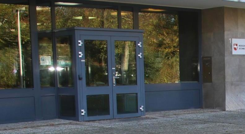 Am Eingang befinden sich mehrere Klingelknöpfe. Das Niedersächsische Justizministerium erreichen Sie über den Klingelknopf am unteren Ende (Abteilung 4) und den Klingelknopf in der Mitte (Landespräventionsrat).