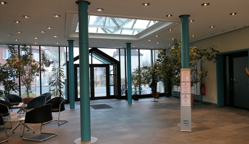 Wenn Sie vom Parkplatz kommen, können Sie die Eingangshalle über den ebenerdigen und barrierefreien hinteren Eingang erreichen.