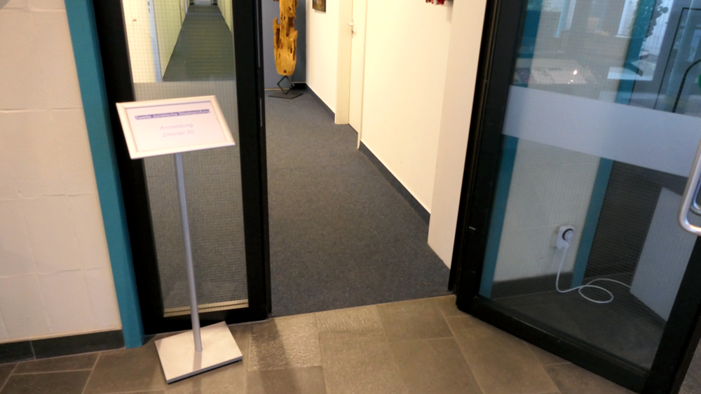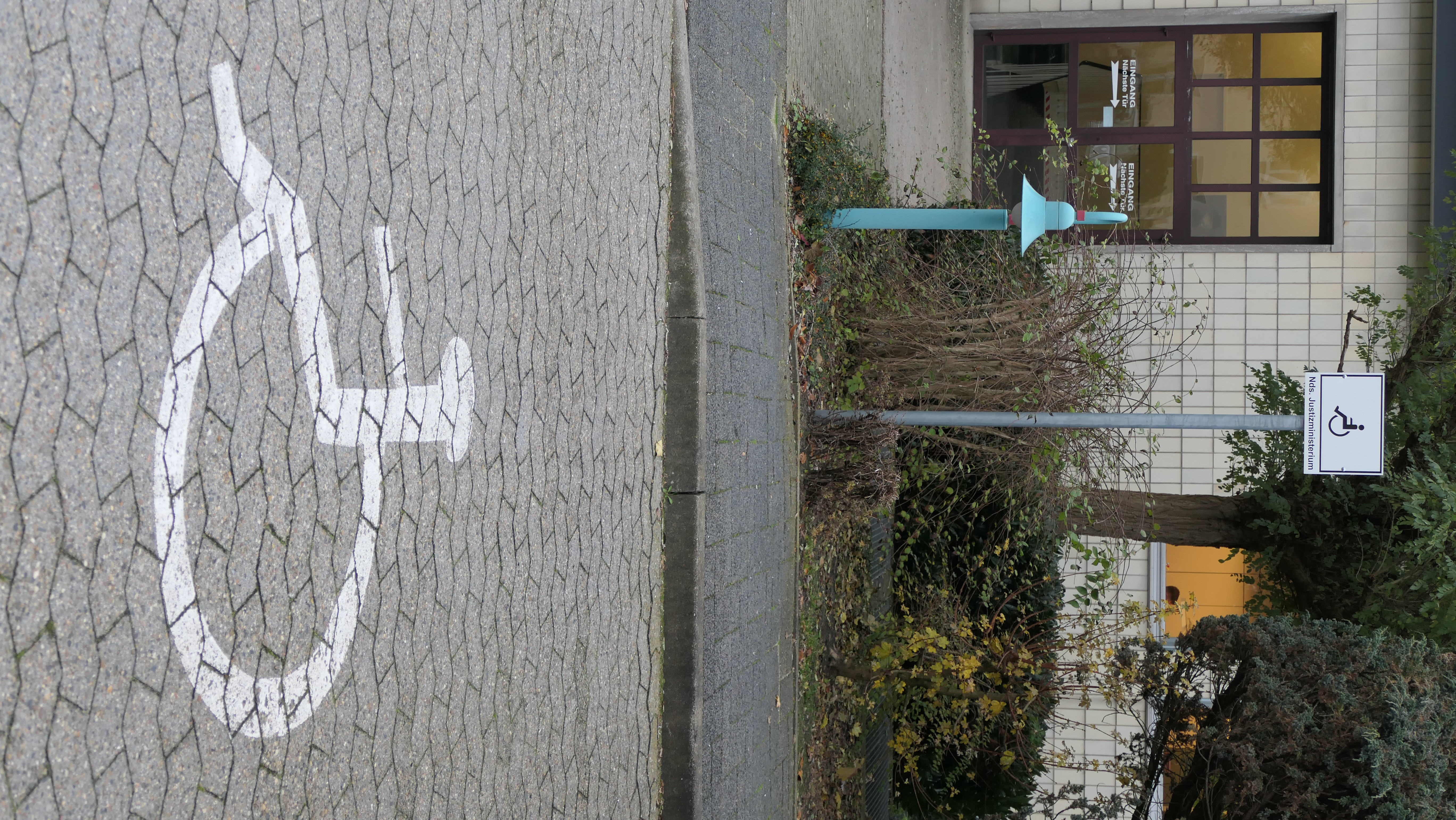 Am Haupteingang befindet sich eine Säule mit mehreren Klingelknöpfen. Wenn Sie zum Landesjustizprüfungsamt wollen und die Eingangstür nicht geöffnet ist, drücken Sie bitte den obersten Klingelknopf. Die Säule ist nicht sehr hoch, so dass die Klingel auch von Rollstuhlfahrern bedient werden kann.