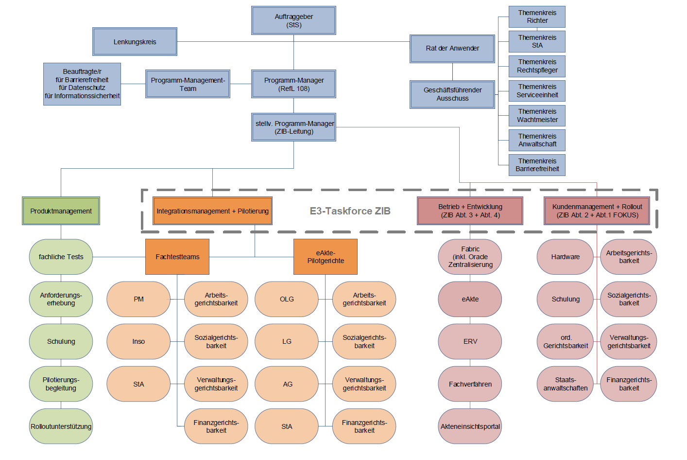 Dem eJuNi-Lenkungskreis gehören aus dem Niedersächsischen Justizministerium die Abteilungsleitungen I und IV sowie die Referatsleitungen der Abteilung I (ohne Ref. 105) und die Gleichstellungsbeauftragte an. Darüber hinaus sind jeweils ein Vertreter/eine Vertreterin des Hauptpersonalrates, des Hauptrichterrats der ordentlichen Gerichtsbarkeit, des Hauptstaatsanwaltsrates und stellvertretend für alle Fachgerichtsbarkeiten ein Vertreter/eine Vertreterin des Richterrats der Arbeitsgerichtsbarkeit sowie der Leiter des zentralen IT-Betriebes Niedersächsische Justiz beteiligt. Der eJuNi-Lenkungskreis übernimmt die Koordination der Programm-Durchführung. Dazu werden dem Lenkungskreis regelmäßig die wesentlichen Ergebnisse berichtet und ggf. von ihm Maßnahmen zur Steuerung, insb. zur Herbeiführung von Entscheidungen des Auftraggebers beschlossen.